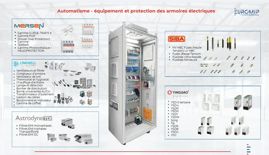 Désormais, Euromip propose une gamme complète de composants pour l’équipement et la protection des armoires électriques.
